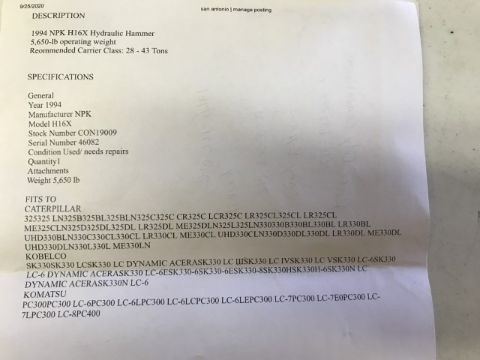 Hydraulic Hammer 1994 NPX H16X 46082 Npx H16x Hydraulic Hammer. Need Some Repairs. Compatible With Multiple Caterpillar Machines. 7572 Location: Atascosa, TX
